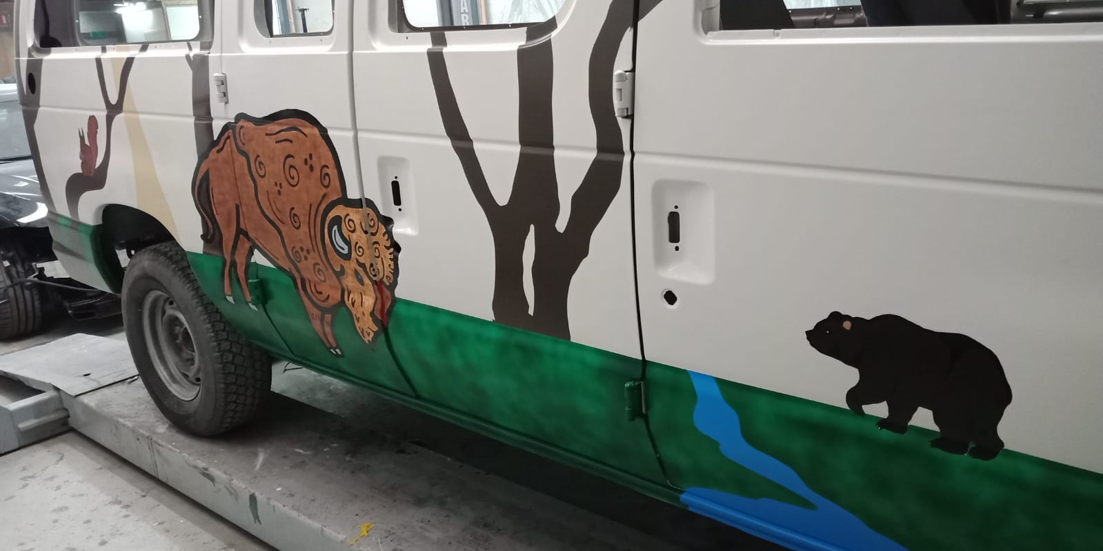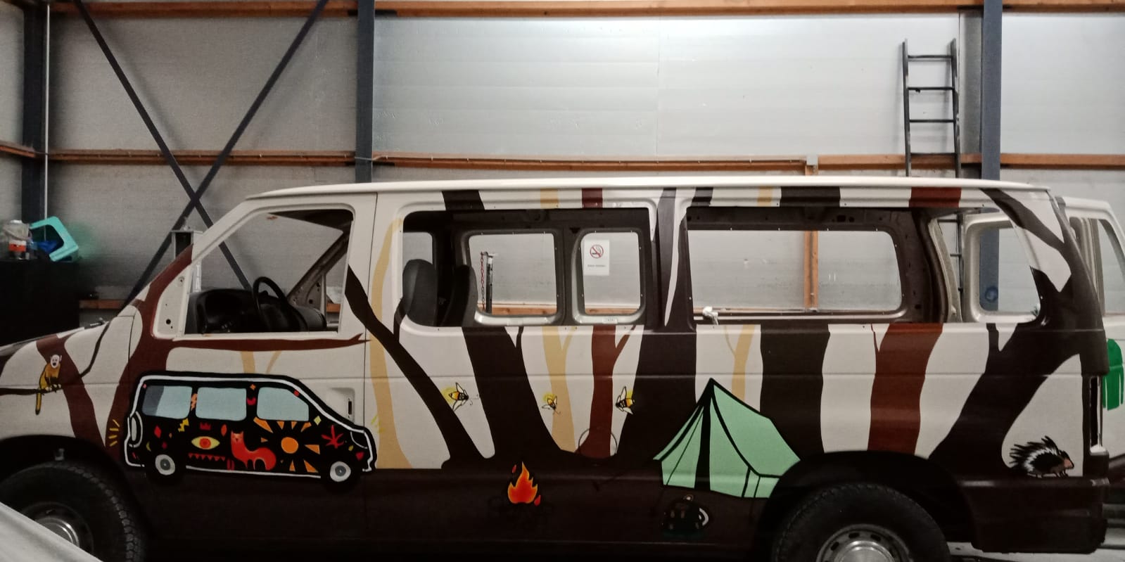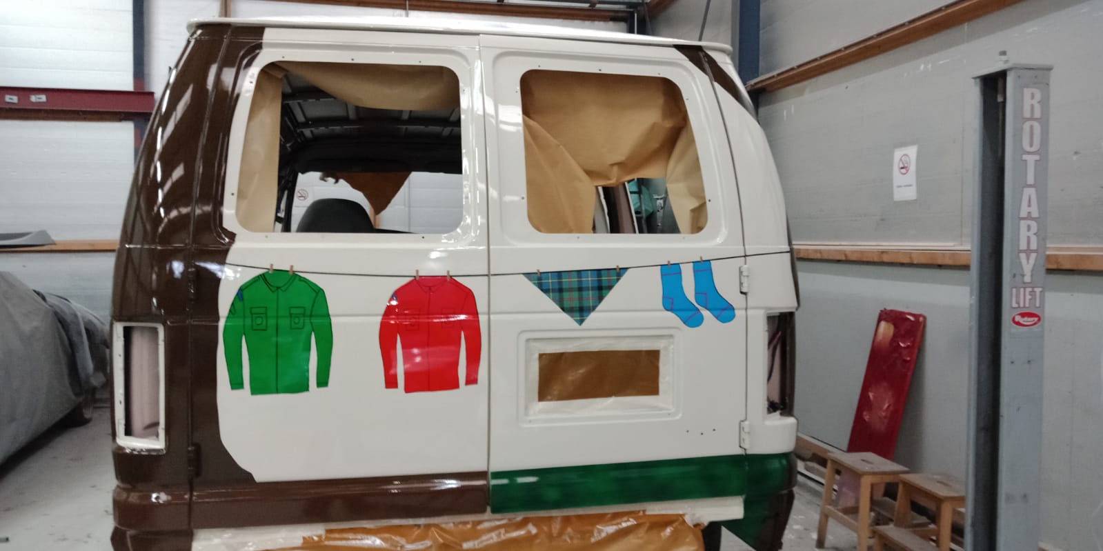 Het moment is gekomen dat we de laatste hand gaan leggen aan ons kunstwerk op de bus. Zoals op de foto te zien is hebben we nog een waslijntje gespannen met onze twee scouting uniformen en de das van Scouting Brigitta (moet eerlijk zeggen dat dit een sticker is die we besteld hebben, om dit te schilderen was erg lastig)