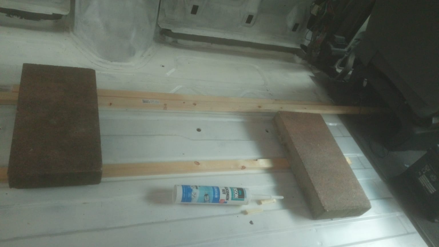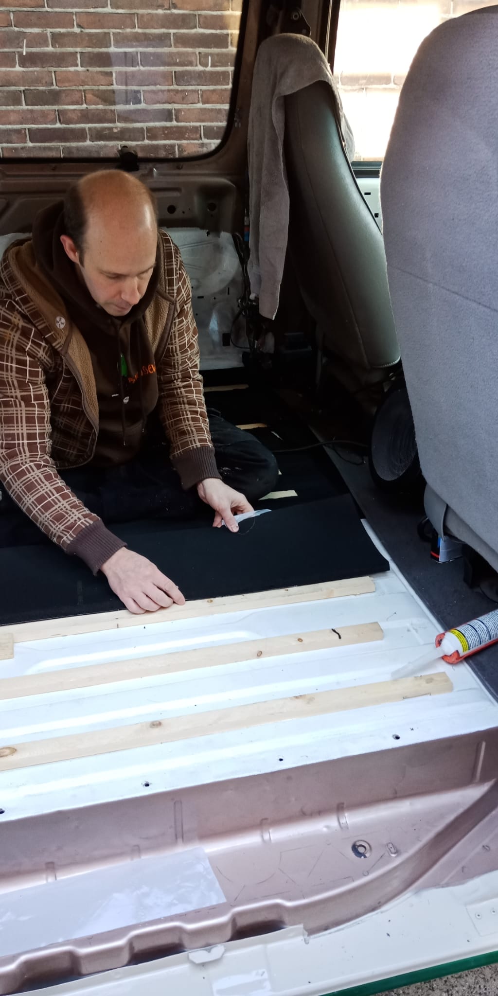 We hebben latten van 18×27 mm vastgeplakt op de bodem. Aangezien er een profiel in de bodem zit hebben we de latten vastgeplakt op het lagere deel. Omdat we Armaflex van 19 mm hebben beseffen we dat dit dan boven de latjes uit zal komen. Wij denken echter dat de Armaflex wel wat kan indeuken als er een plaat hout op komt te liggen. Dit zal uiteraard niet ten goede komen aan de isolatie waarde, maar dat nemen we voor lief.