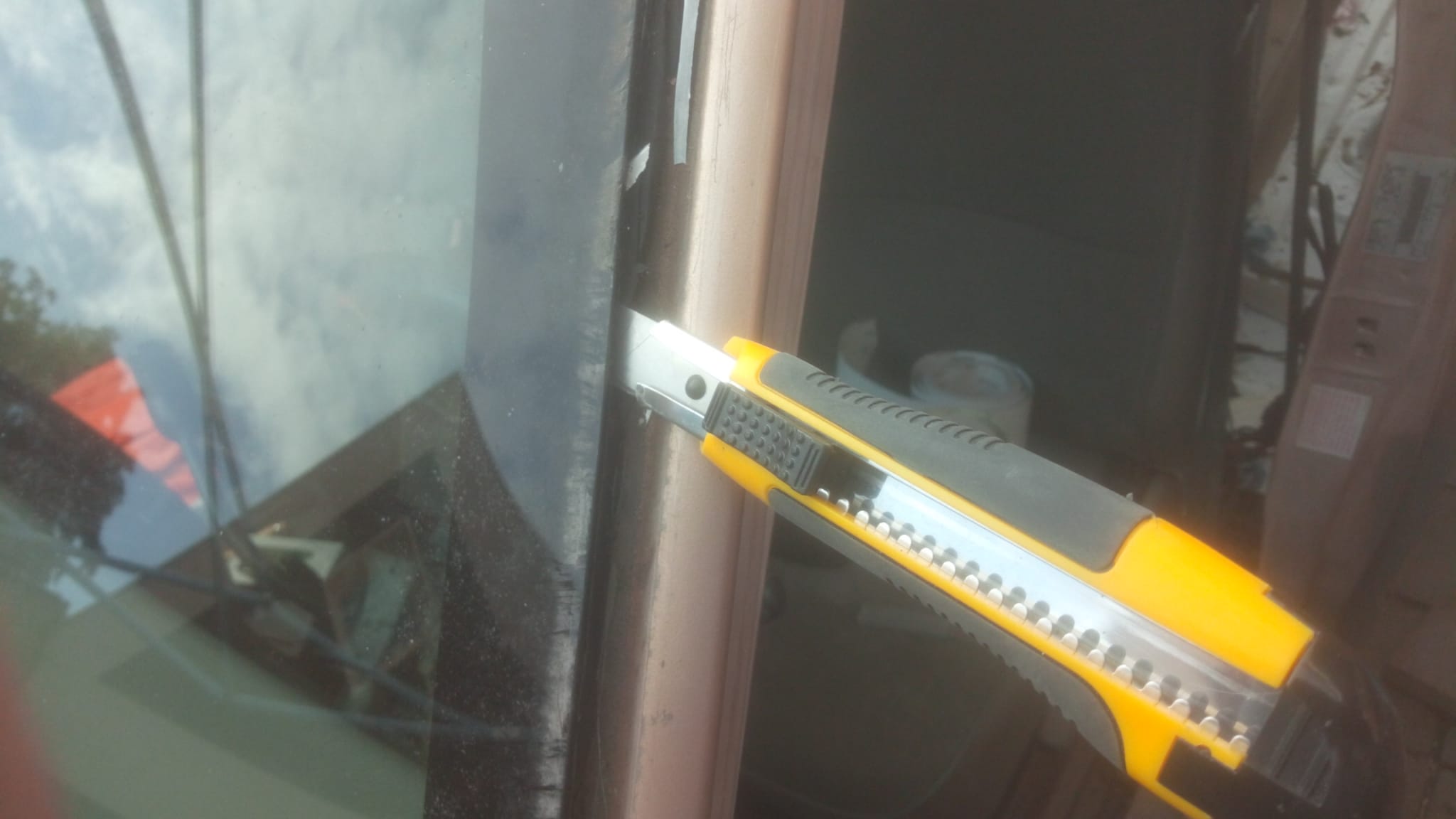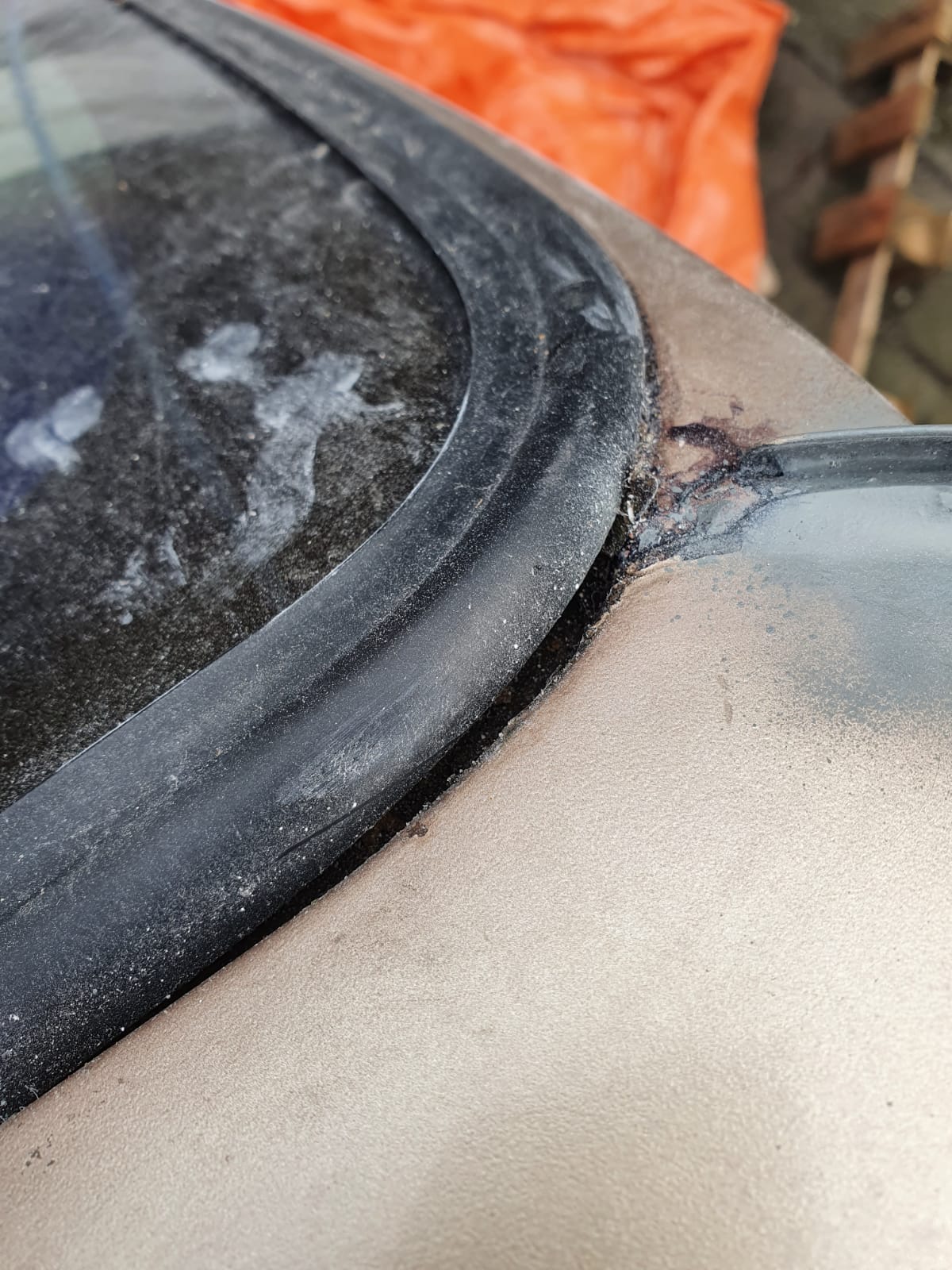 Voordat het zover is moeten we eerst nog de voorruit verwijderen. Het oude rubber zit er niet goed omheen waardoor het water tussen het rubber kan lopen. Daardoor kunnen de raamstijlen natuurlijk weer gaan roesten en wegrotten. Dat lijkt ons geen goed idee.